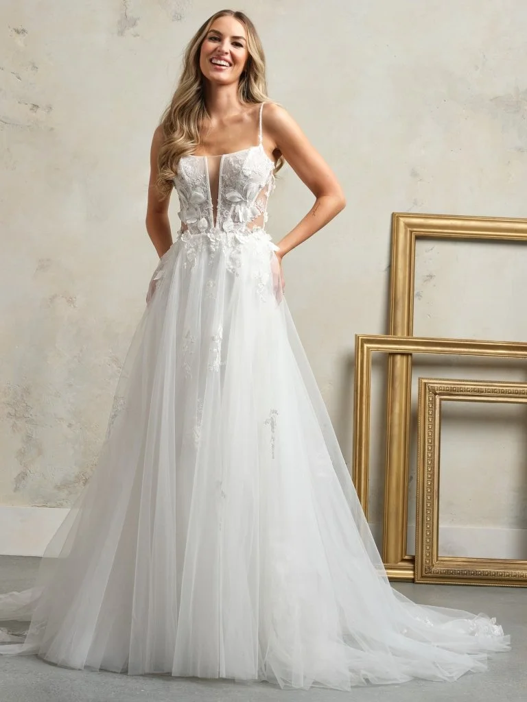 White wedding dress with floral appliqué details and spaghetti straps on a mannequin.